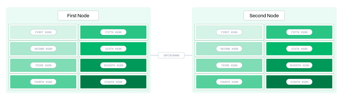 A high-bandwidth interconnect like InfiniBand connects two 8xH100 GPU nodes for inference.The gold standard for an H100 node is the NVIDIA DGX H100. However, many cloud providers instead buy GPUs directly and build their chassis in-house or order it from a third-party vendor to save on cost and customize it to their needs. It’s important to review the exact specs of the H100 nodes you’re using before setting up multi-node inference, as there is variation from provider to provider in the chassis, networking hardware, and auxiliary components.